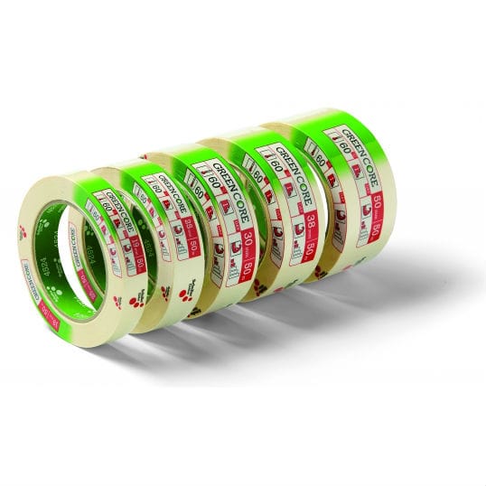 Schuller Green Core – Afplaktape 60°C. Crêpepapier met gemiddelde kleefkracht, perfect voor gladde oppervlakken. Deze tape met een rollengte van 50 meter is ideaal voor het verven en lakken van projecten waarbij water- of oplosmiddelverdunning gebruikt wordt.