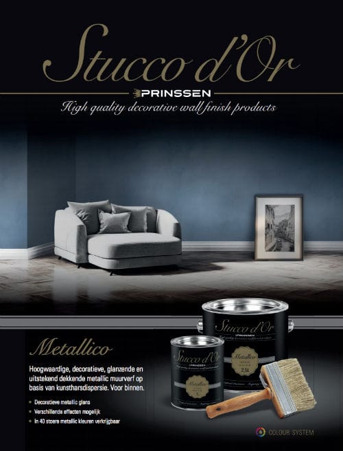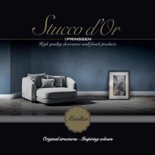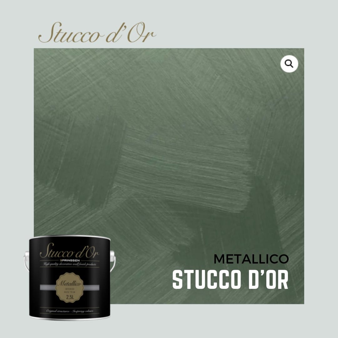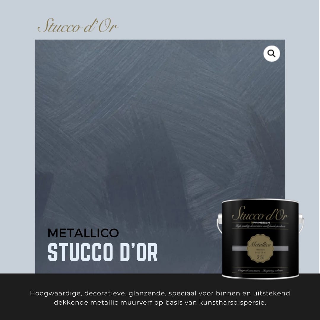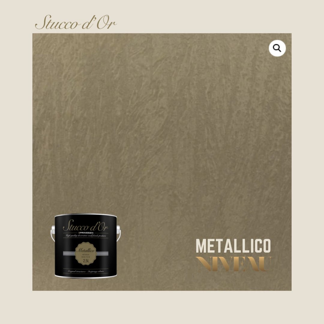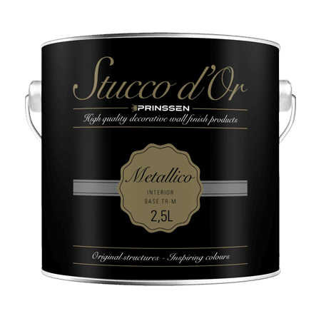 Stucco d’Or Metallico | Is een professionele, decoratieve muurverf op basis van kunstharsdispersie, speciaal ontwikkeld voor een luxe metallic uitstraling op muren en plafonds. Door de hoogwaardige samenstelling realiseert u een glanzend resultaat dat direct de aandacht trekt. De verf is ademend, reukarm en goed afwasbaar, ideaal voor stijlvolle ruimtes zoals woonkamers, slaapkamers of representatieve kantoorruimten.
